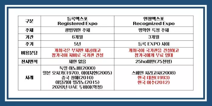 위의 표와 같이 엑스포는 등록엑스포와 인정엑스포 둘로 나뉘는데 가장 큰 차이점은 비용 부담의 주최라고 볼 수 있겠습니다.